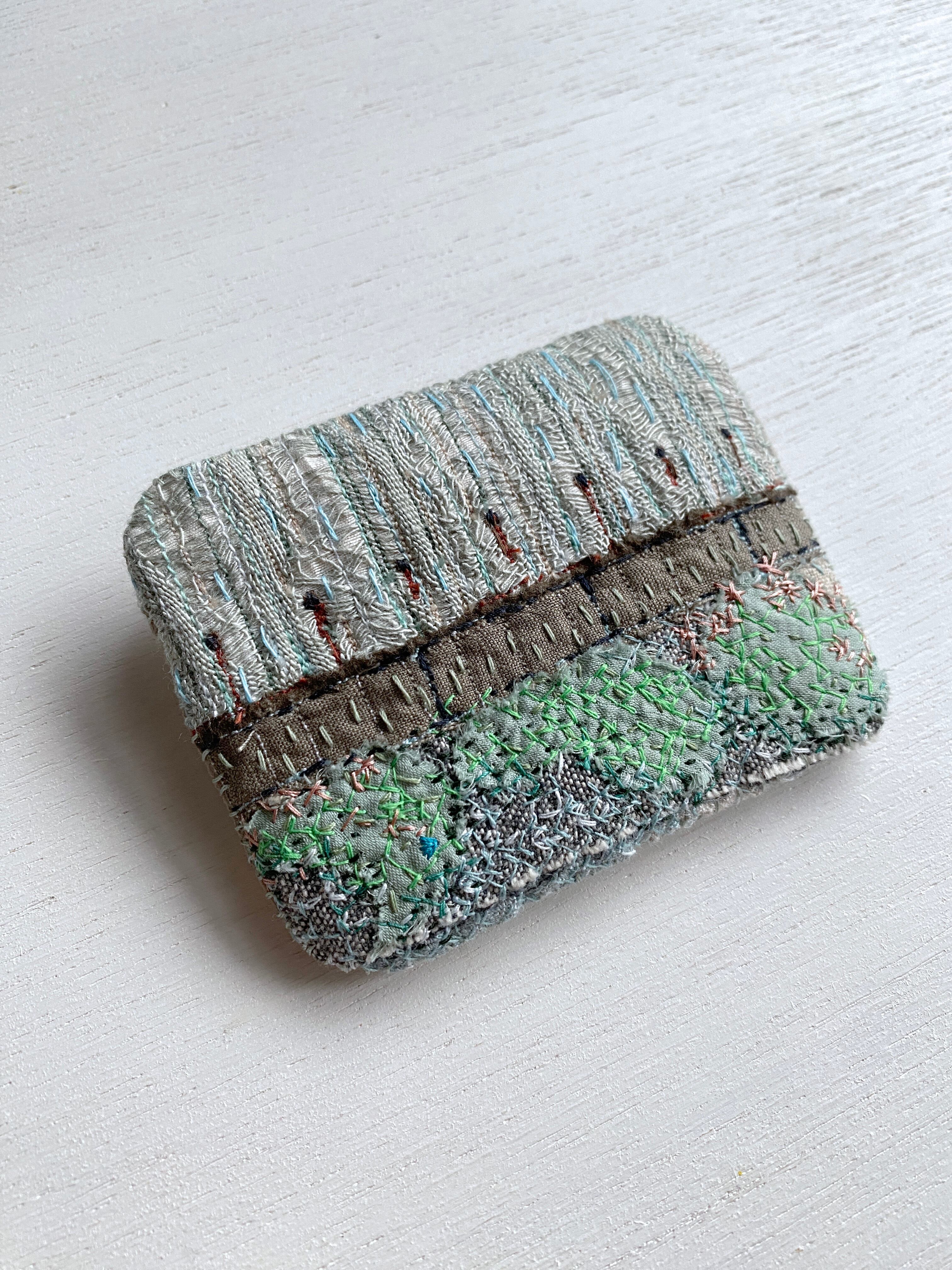 波打ちトタンと紫片喰の絵から生まれたブローチになります。