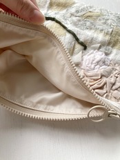 生地を染めるところから葉リースの絵を刺繍に落とし込み、ポーチの形になるまで全て手作業一点ものになります。