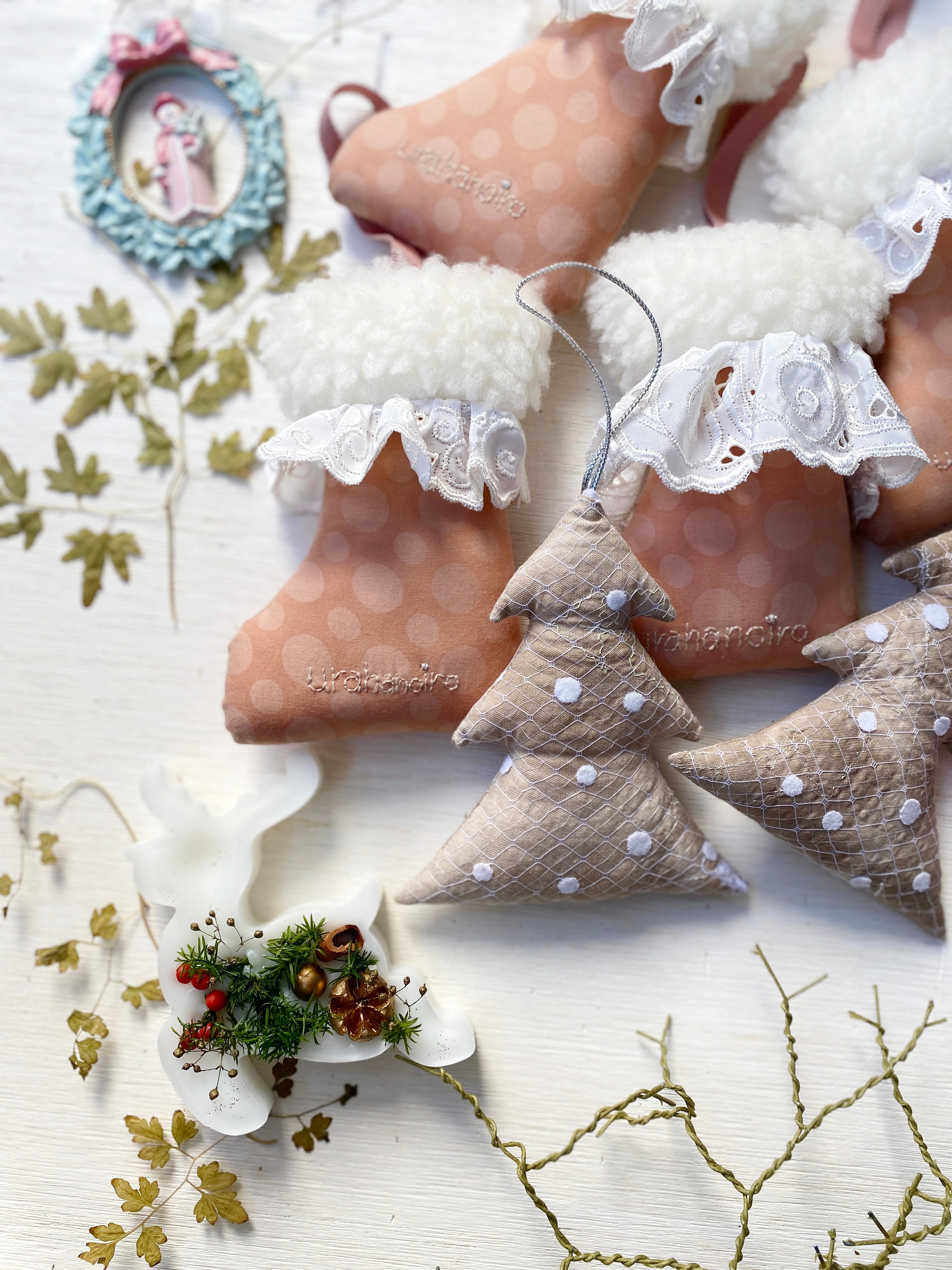 アボカドの皮と種を煮出し、生地を染めてから仕立てたクリスマスオーナメントです。