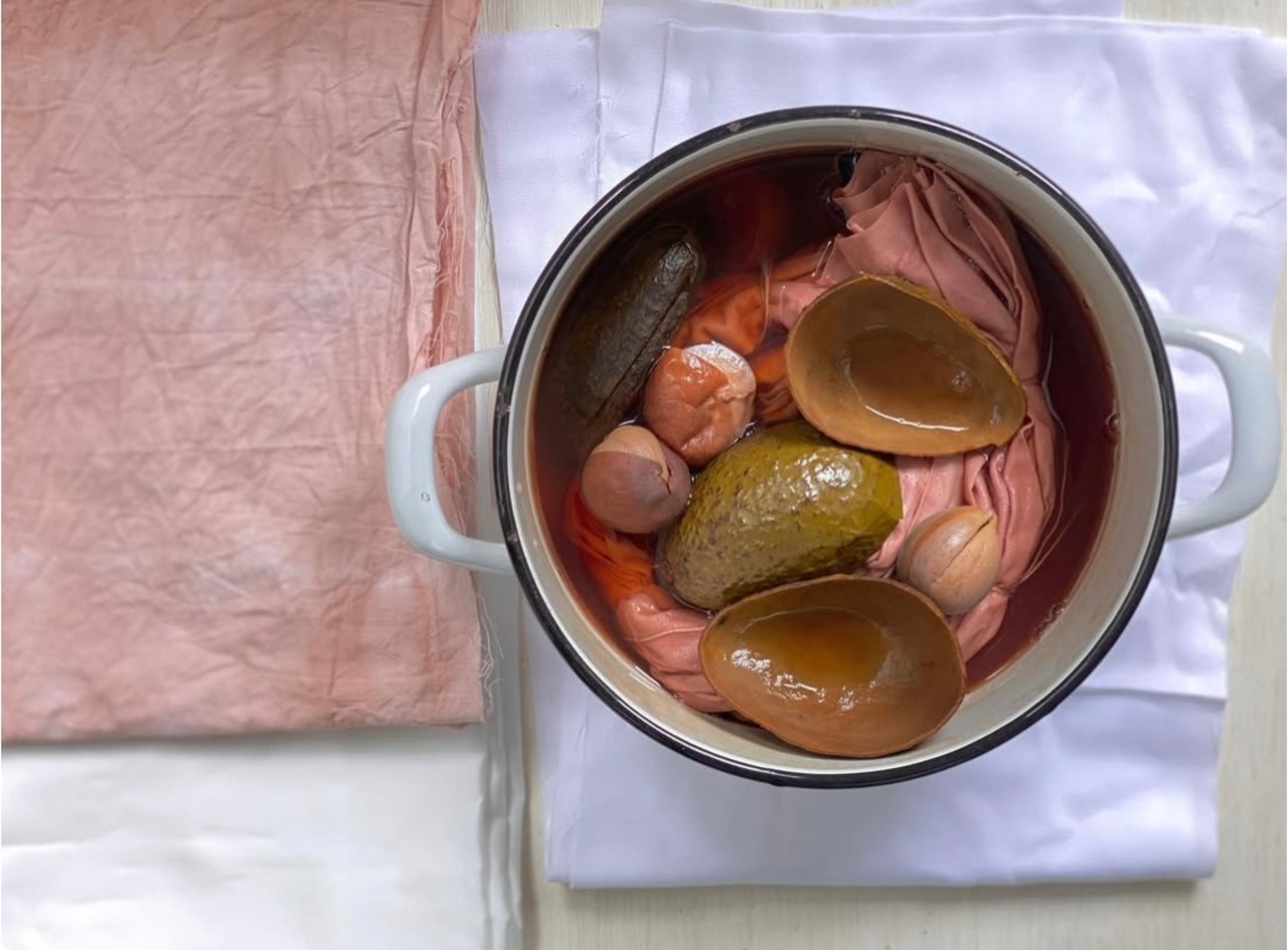 アボカドの皮と種を煮出し、生地を染めてから仕立てたクリスマスオーナメントです。
