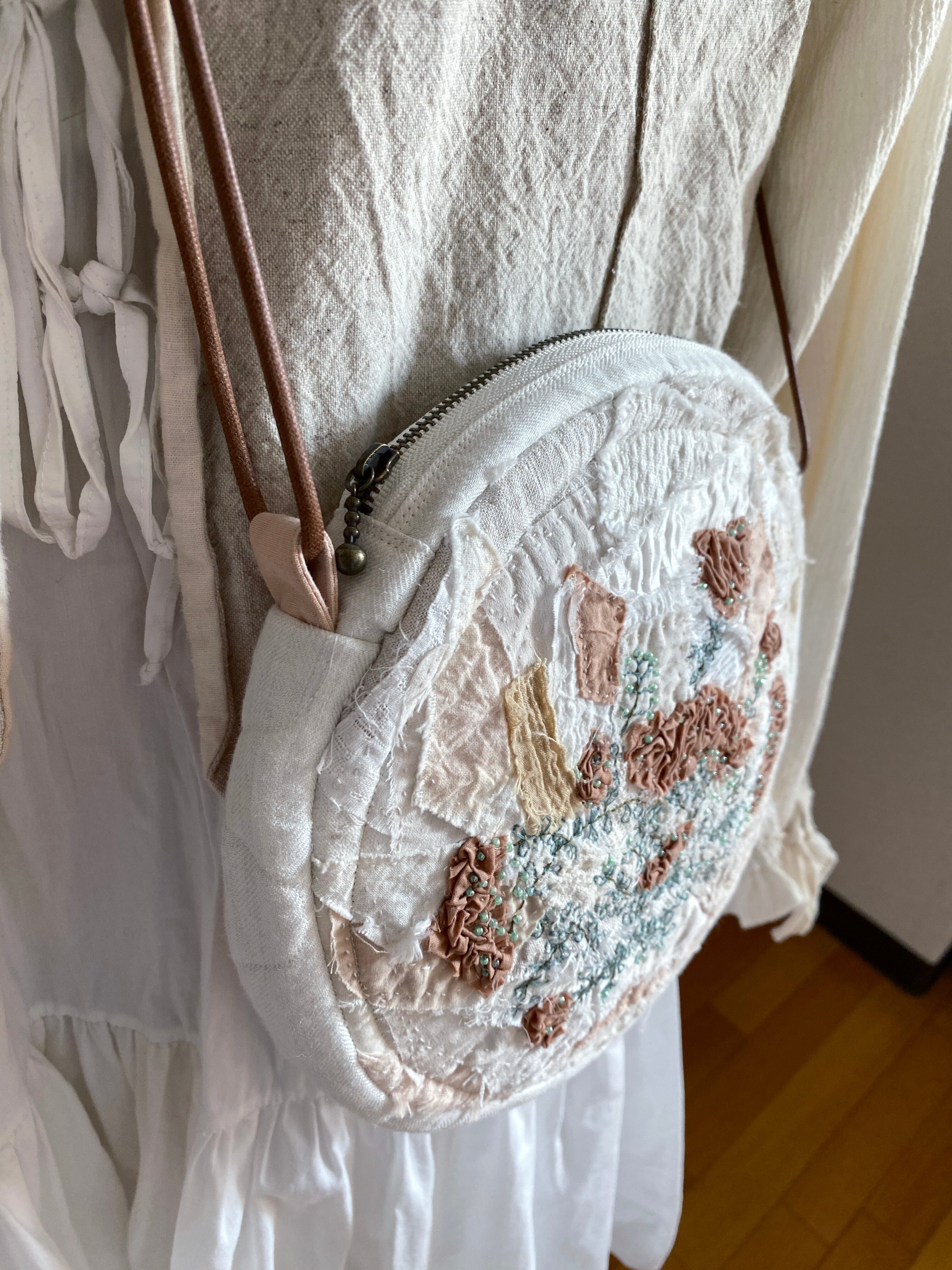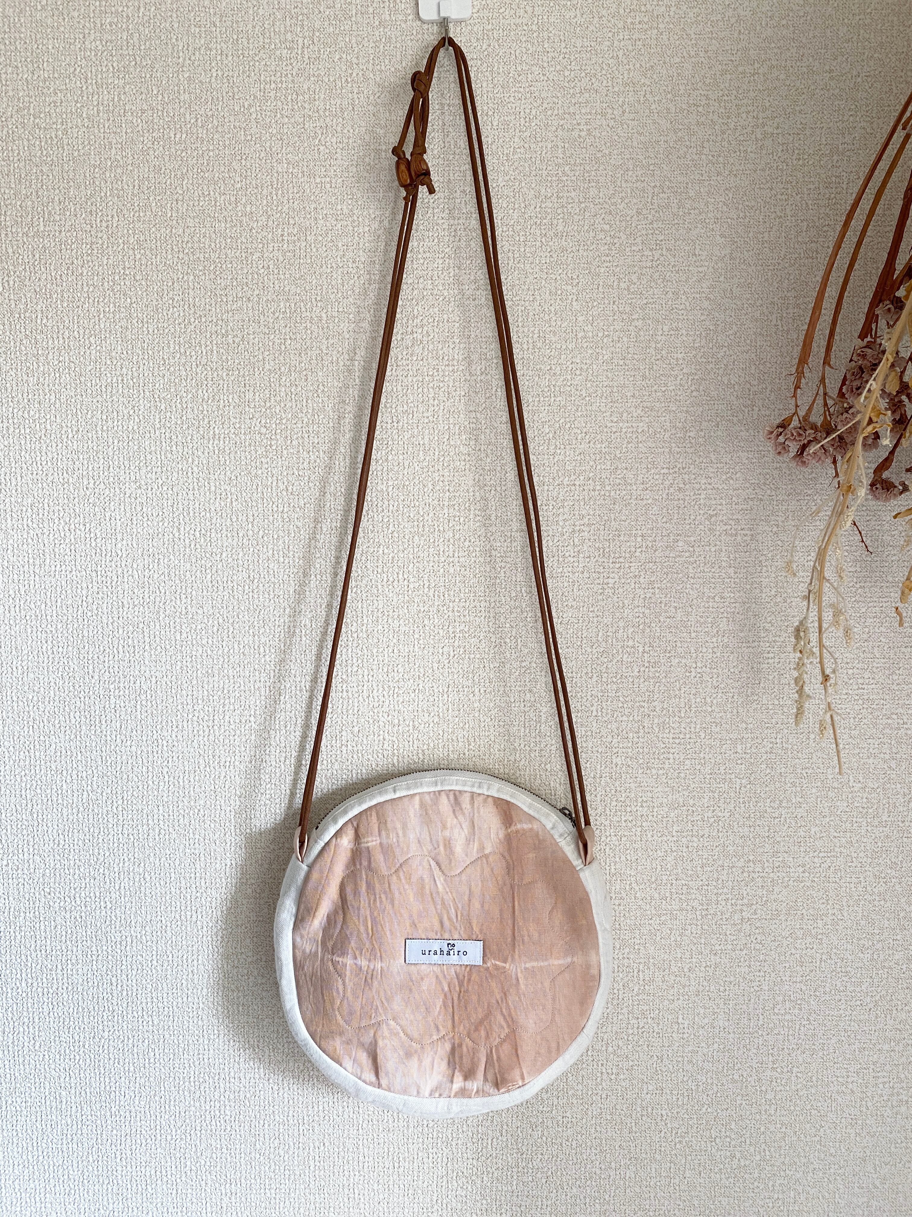 生地を染めるところから百日紅の絵を刺繍に落とし込み、ポシェットの形になるまで全て手作業一点ものになります。
