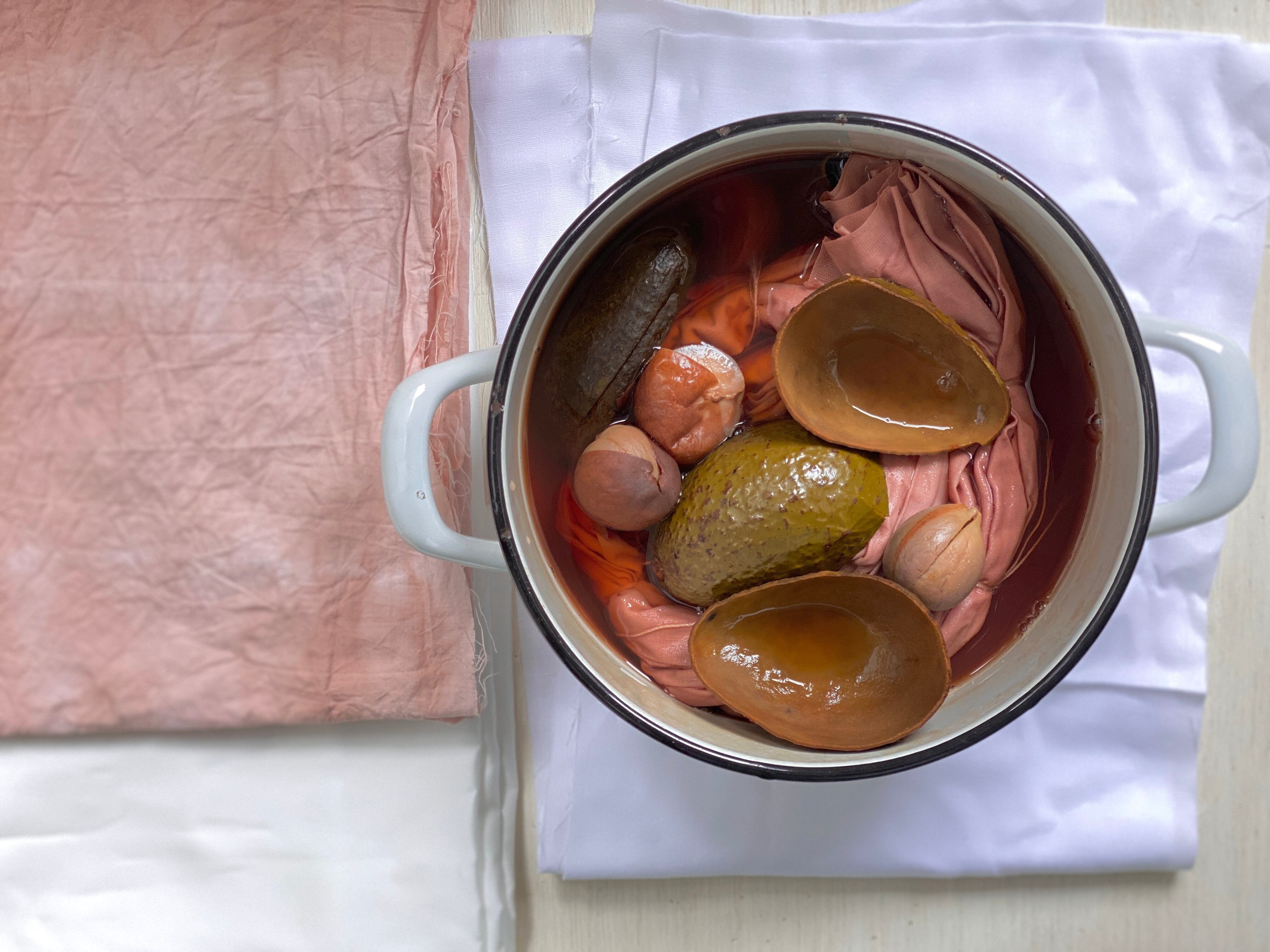 花びらにはアボカドの皮と種で染めた生地を使っております。