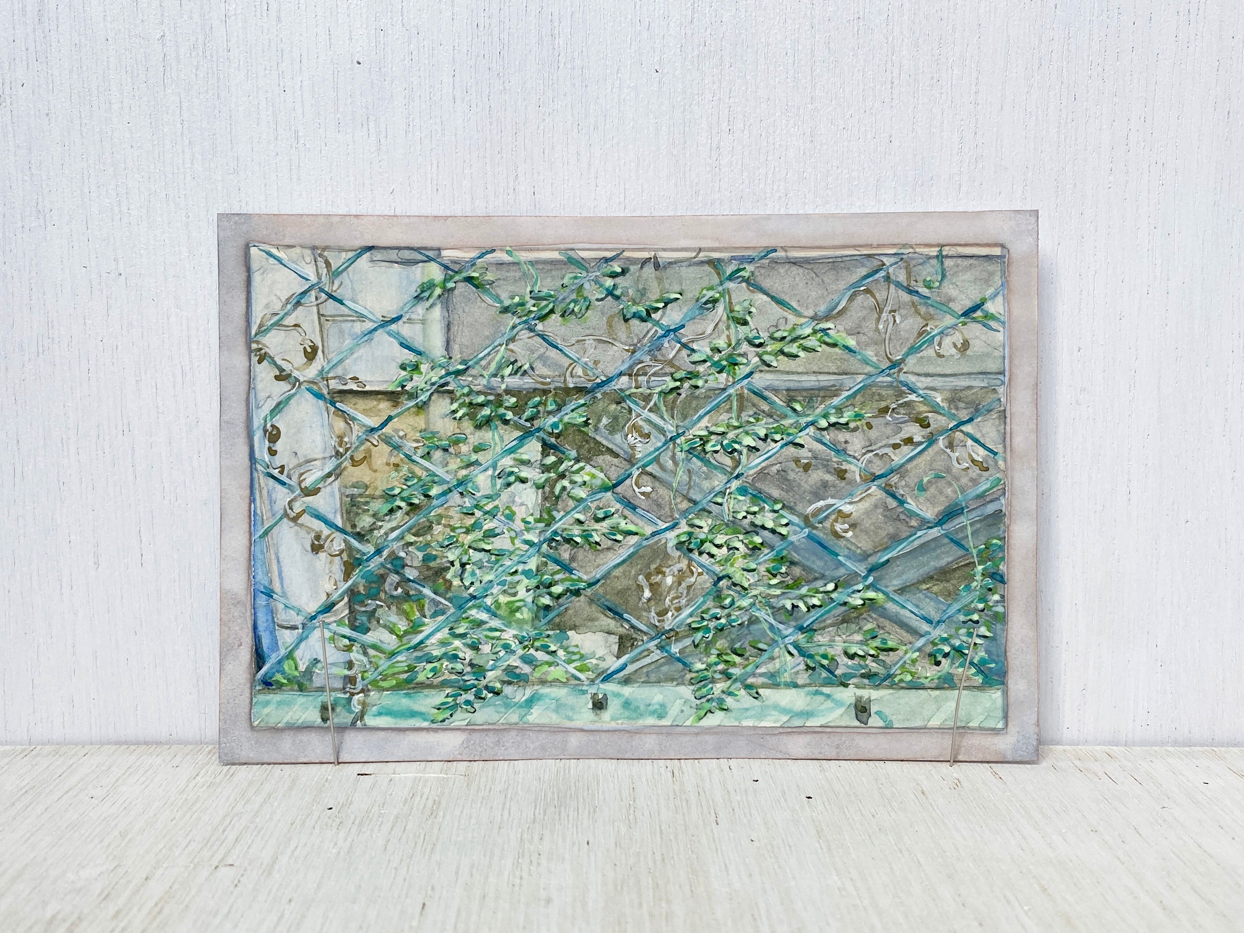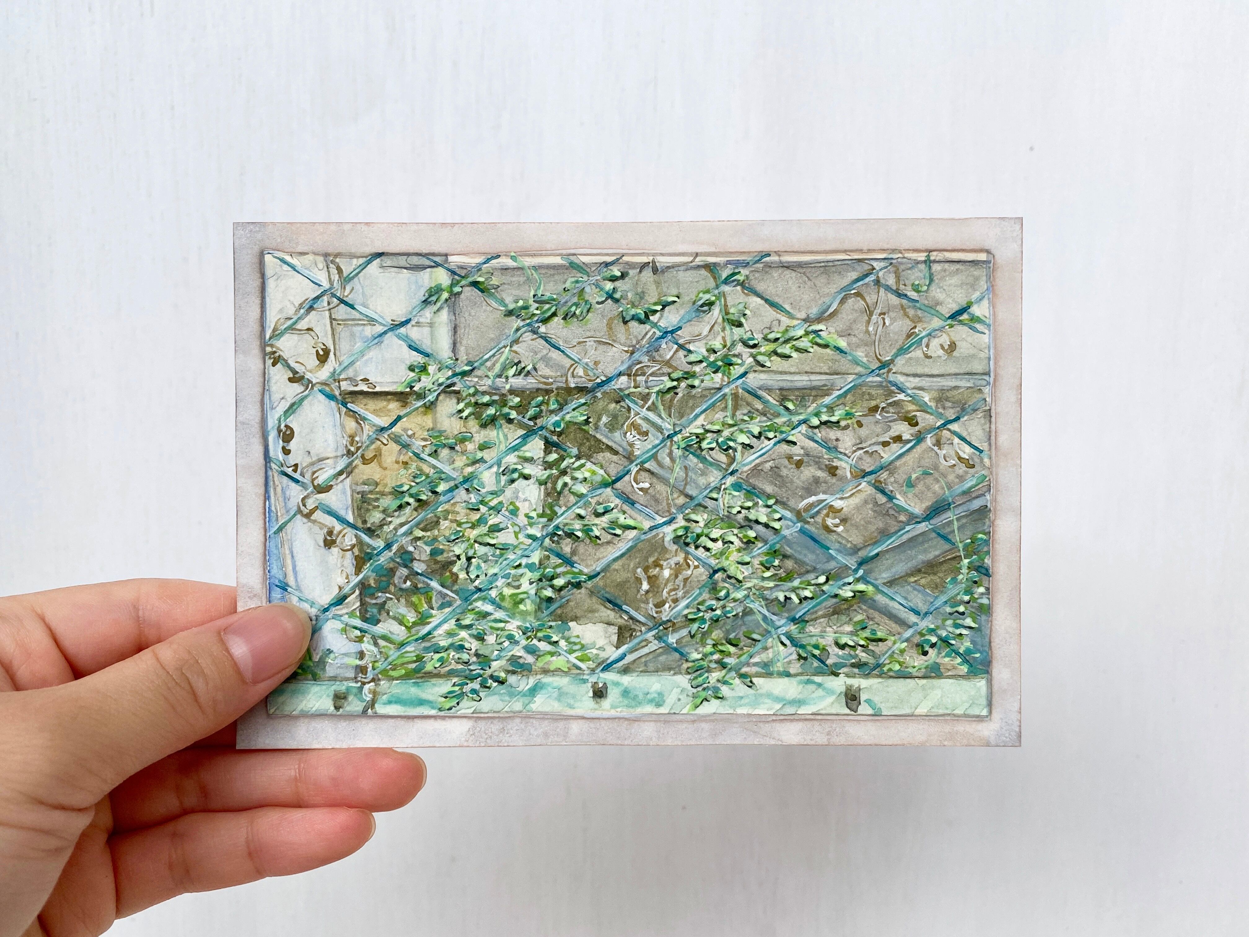 くるくるとツルが伸びて、葉のフェンスになる様子を描いています。