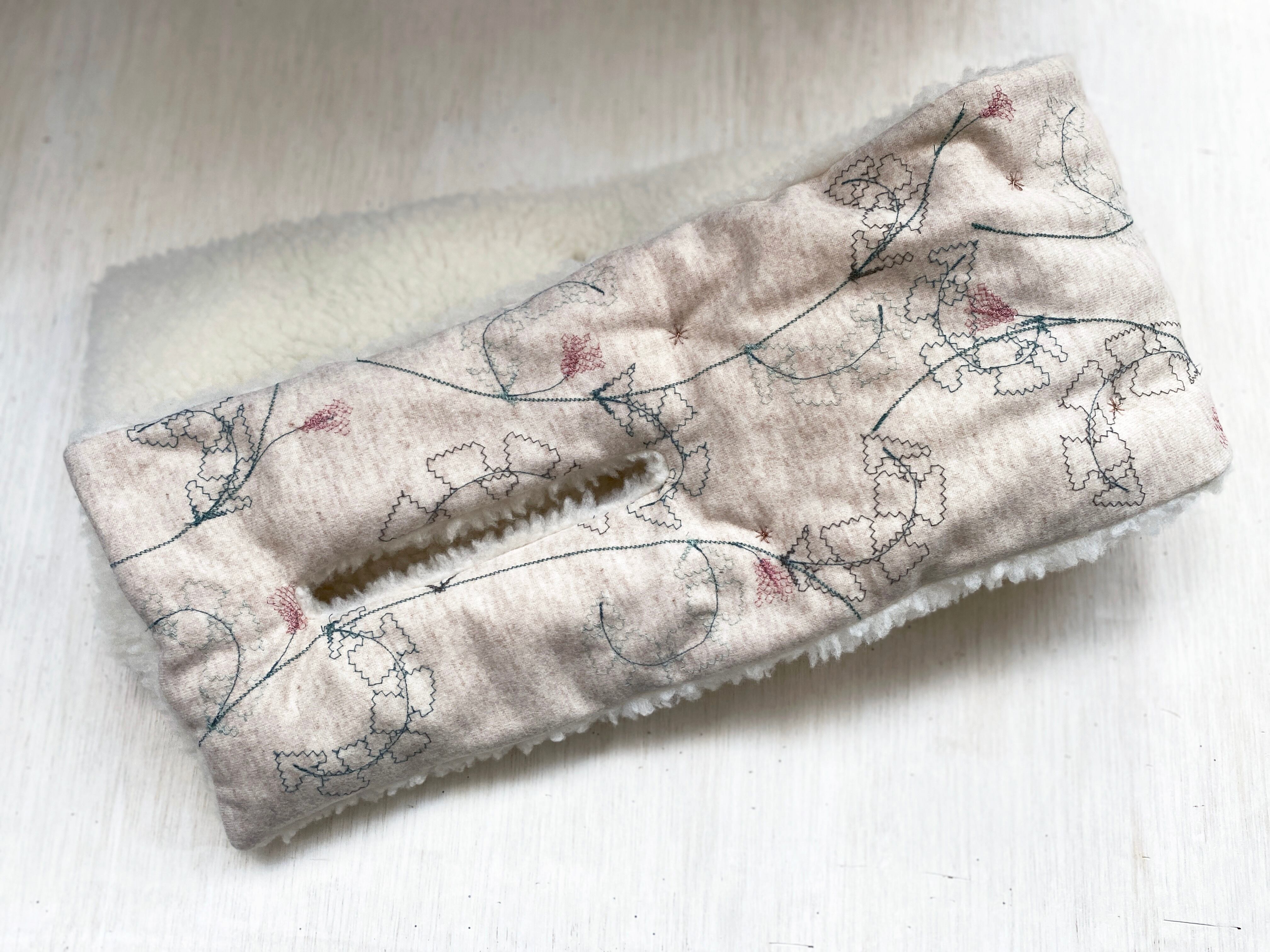 表の刺繍はオニノゲシをモチーフにしたデザインのミシン刺繍になります。ふんわりと軽い素材でしっかりと首元を包んでくれます。